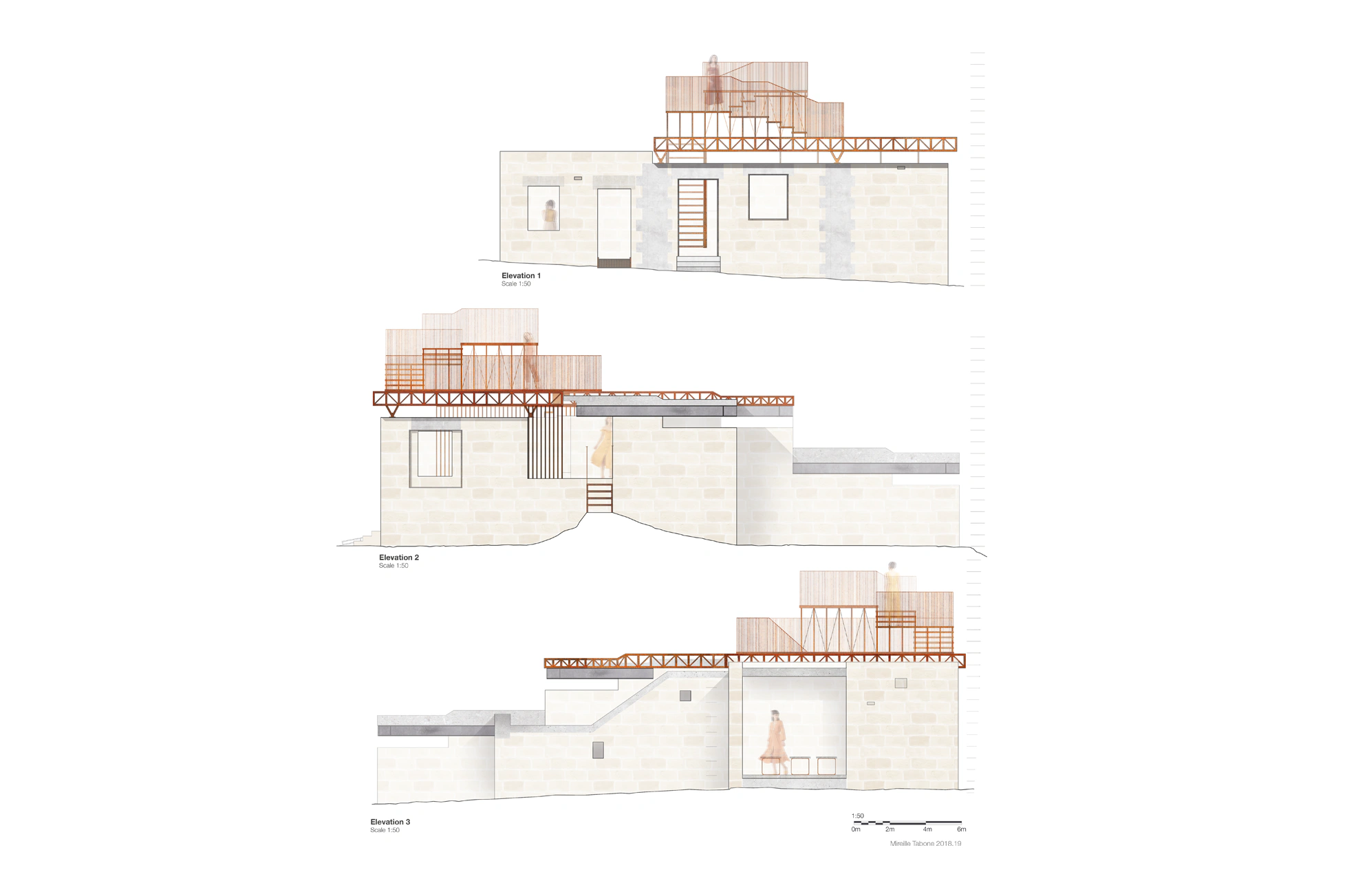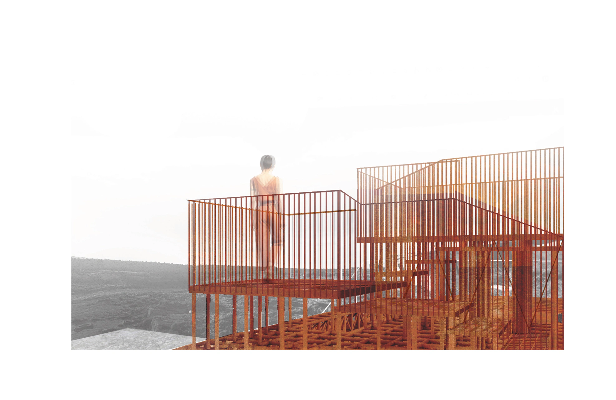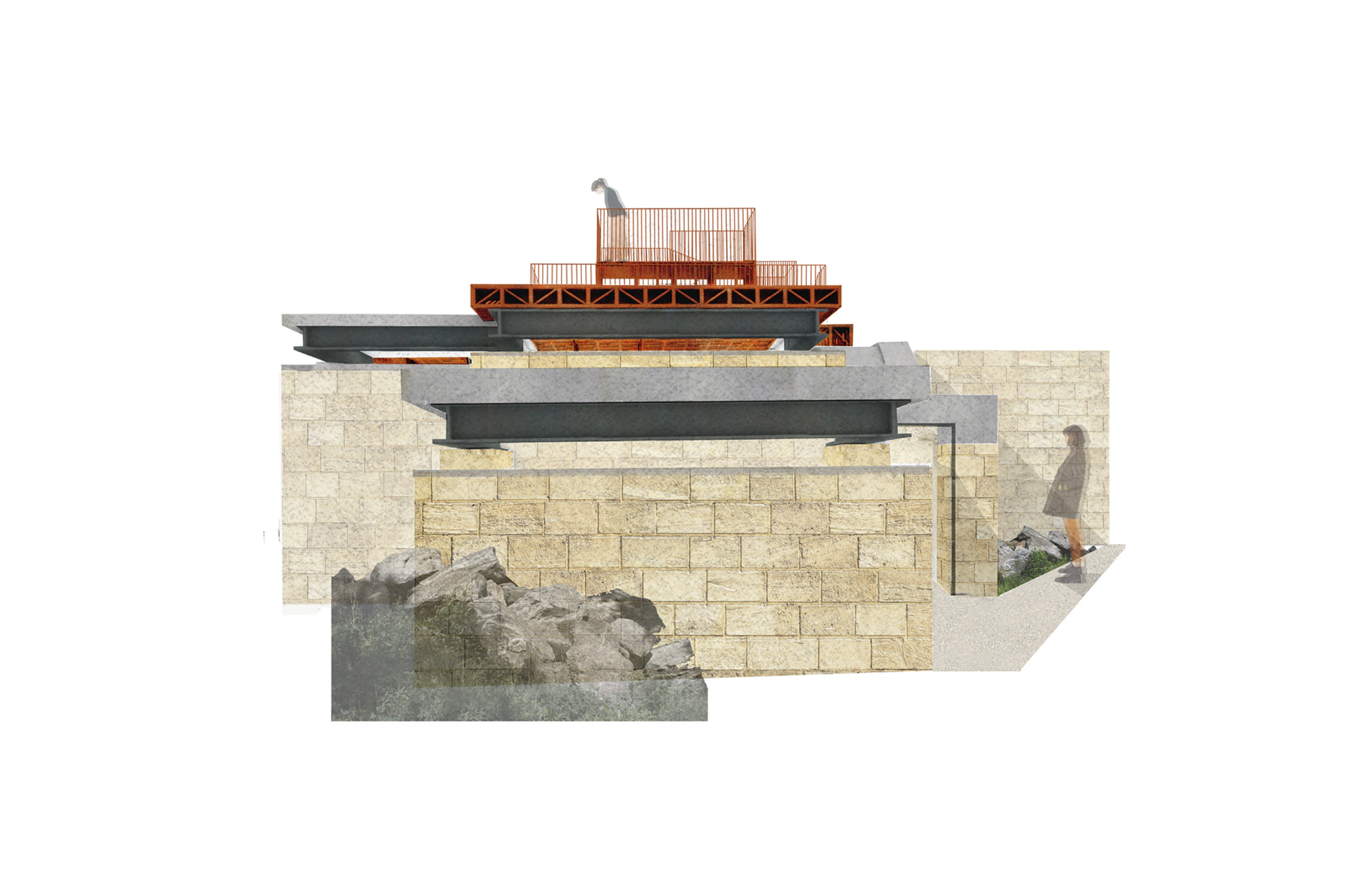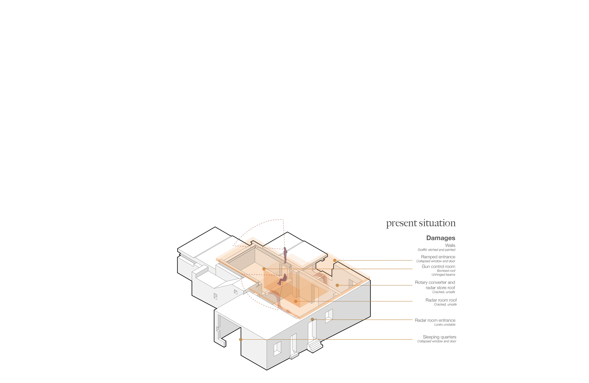 As a ruin, the BoP’s identity has evolved. The predetermined programme as laid out by the building’s function has been broken through a process of deformation. It is now a place to explore, to discover, to play. From a fort closed within itself, it is now open, a wound, in the countryside. The proposal aims to respect the newfound freedom through a permeable intervention that allows exploration in and around the structure while honouring the massing and volume that it used to have. The space frame structure and the observation deck are a nod towards the 19th century silhouette and the original observation use at the highest point.