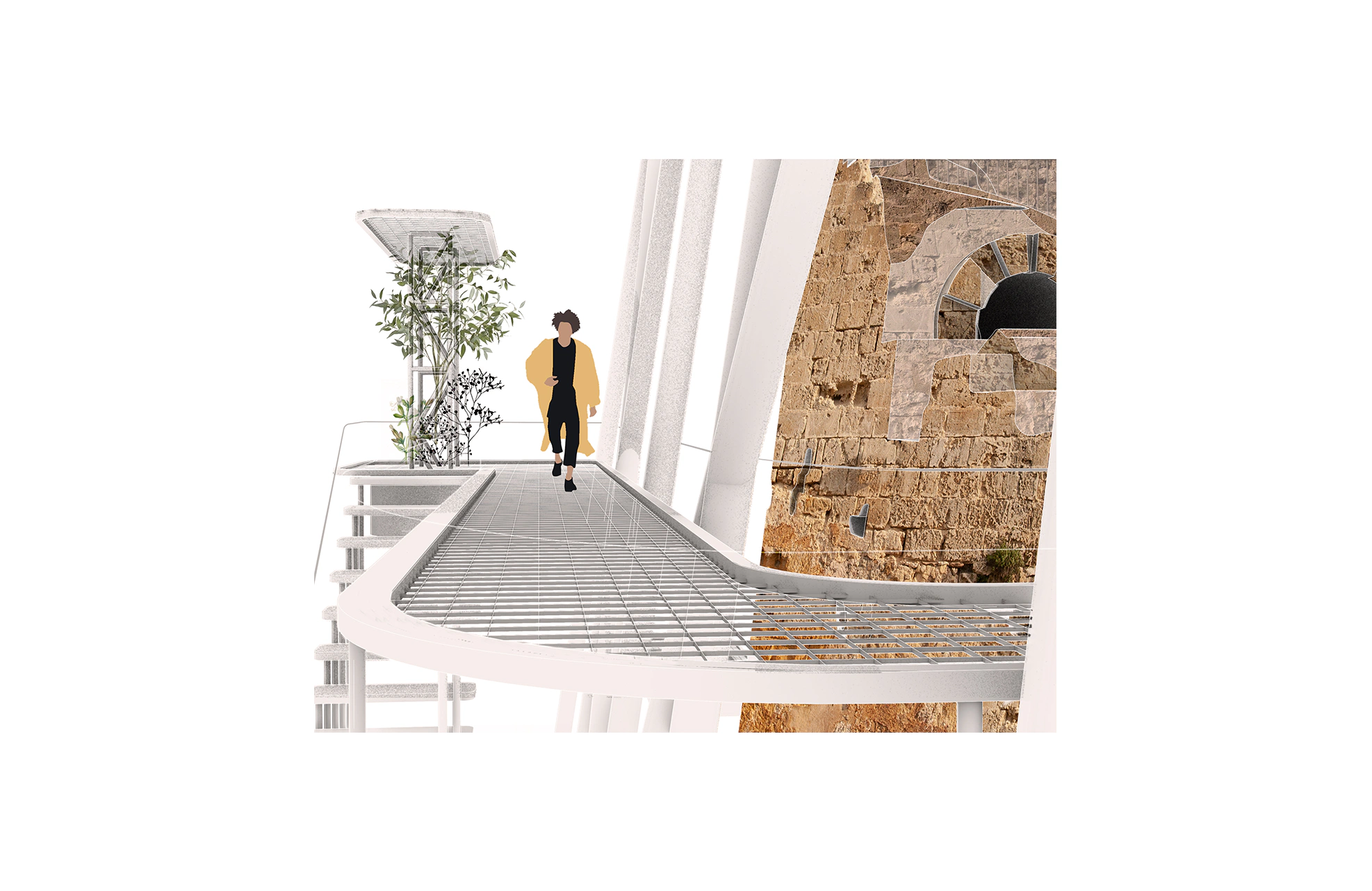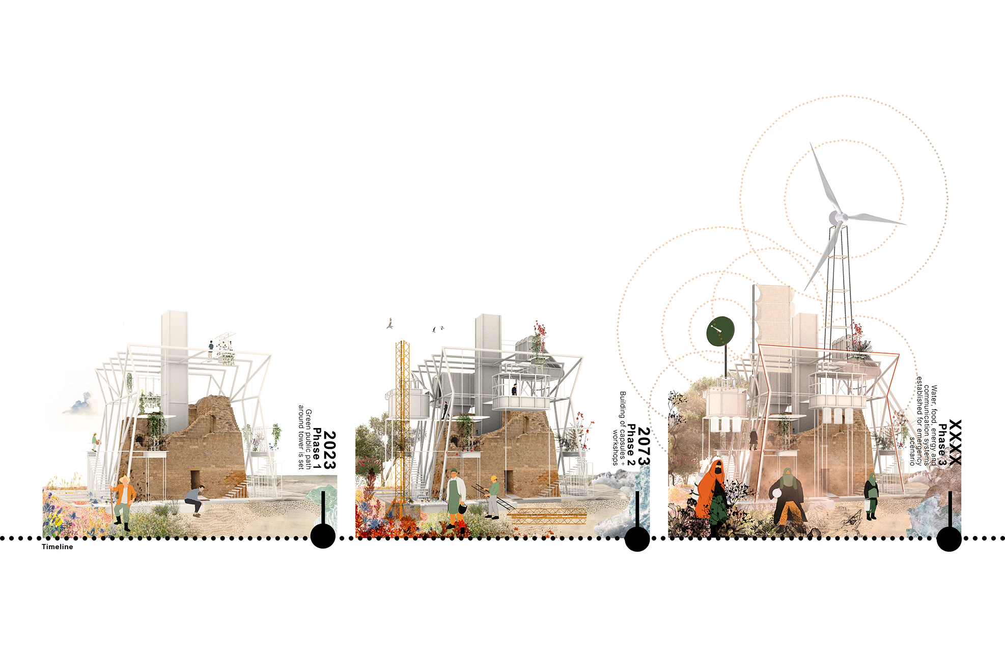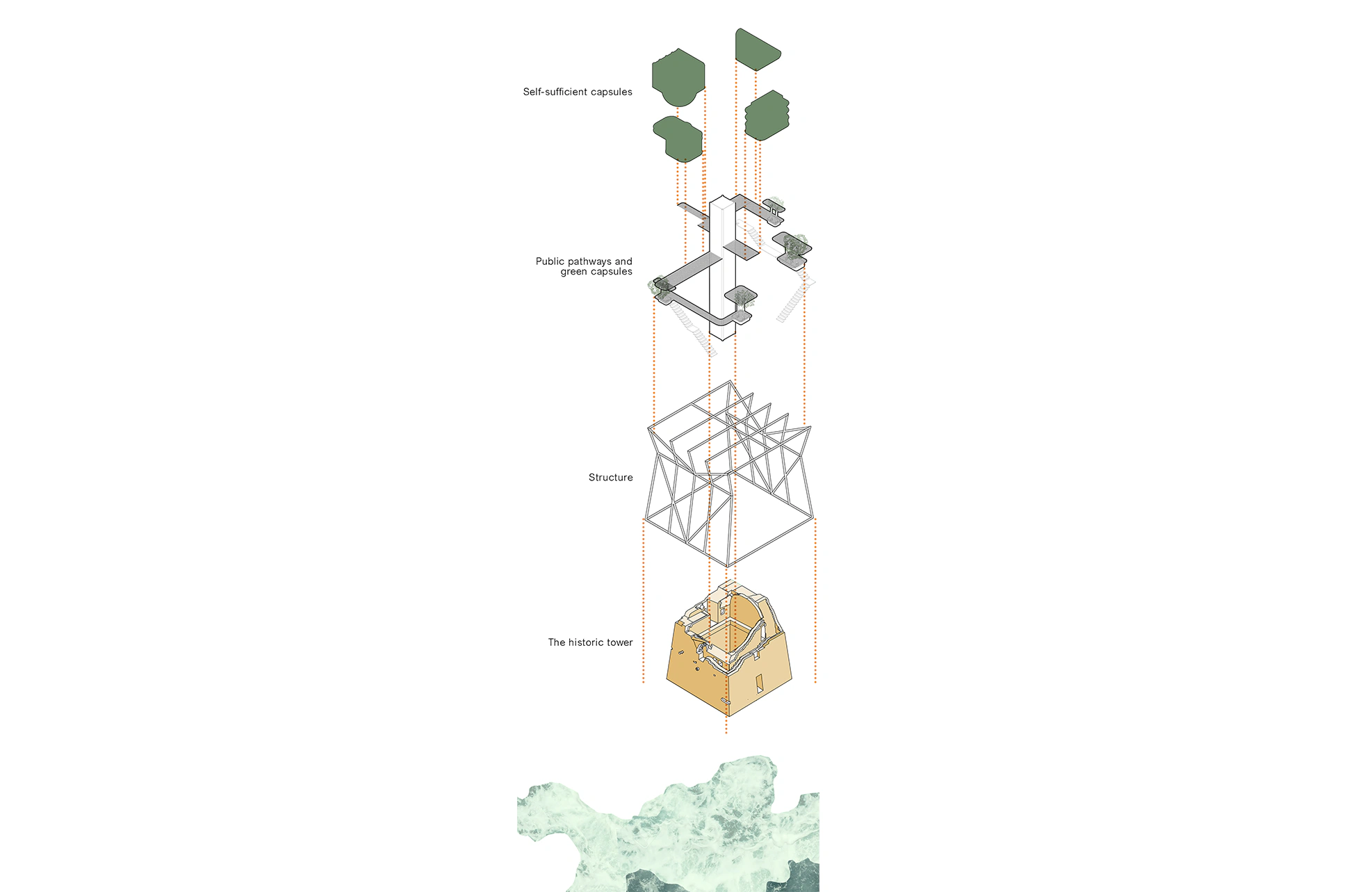 This project therefore looks at the uncertainty in our future and how the Tower can act once again within a system to assist the community in a crisis. The first step is establishing green public pathways and areas around the tower with plants that thrive in marine environments. With the skills of the locals, a steel structure is erected to support a public pathway at different levels, connected through a lift and several staircases. With planters throughout, the tower is transformed into a public garden.