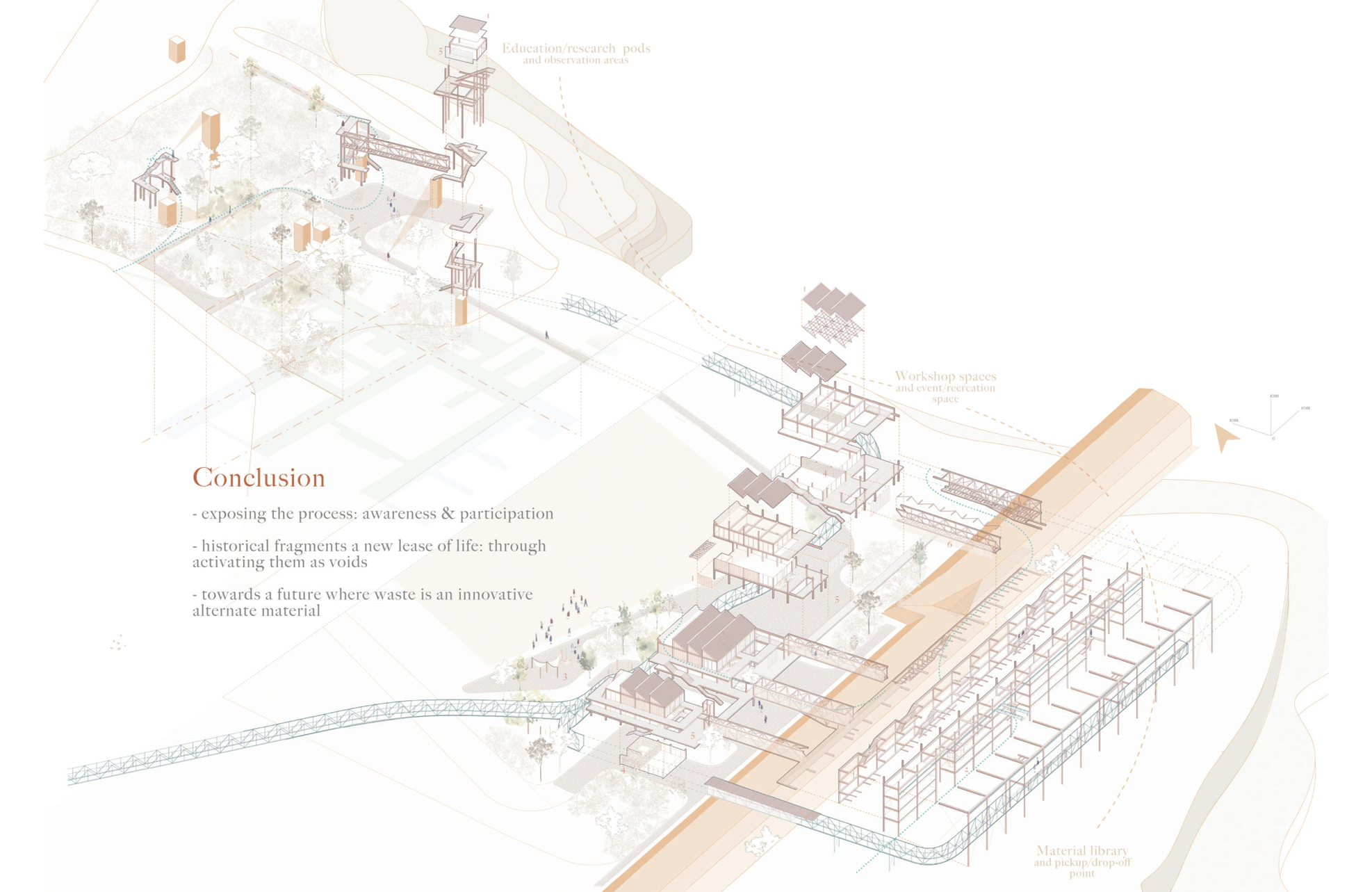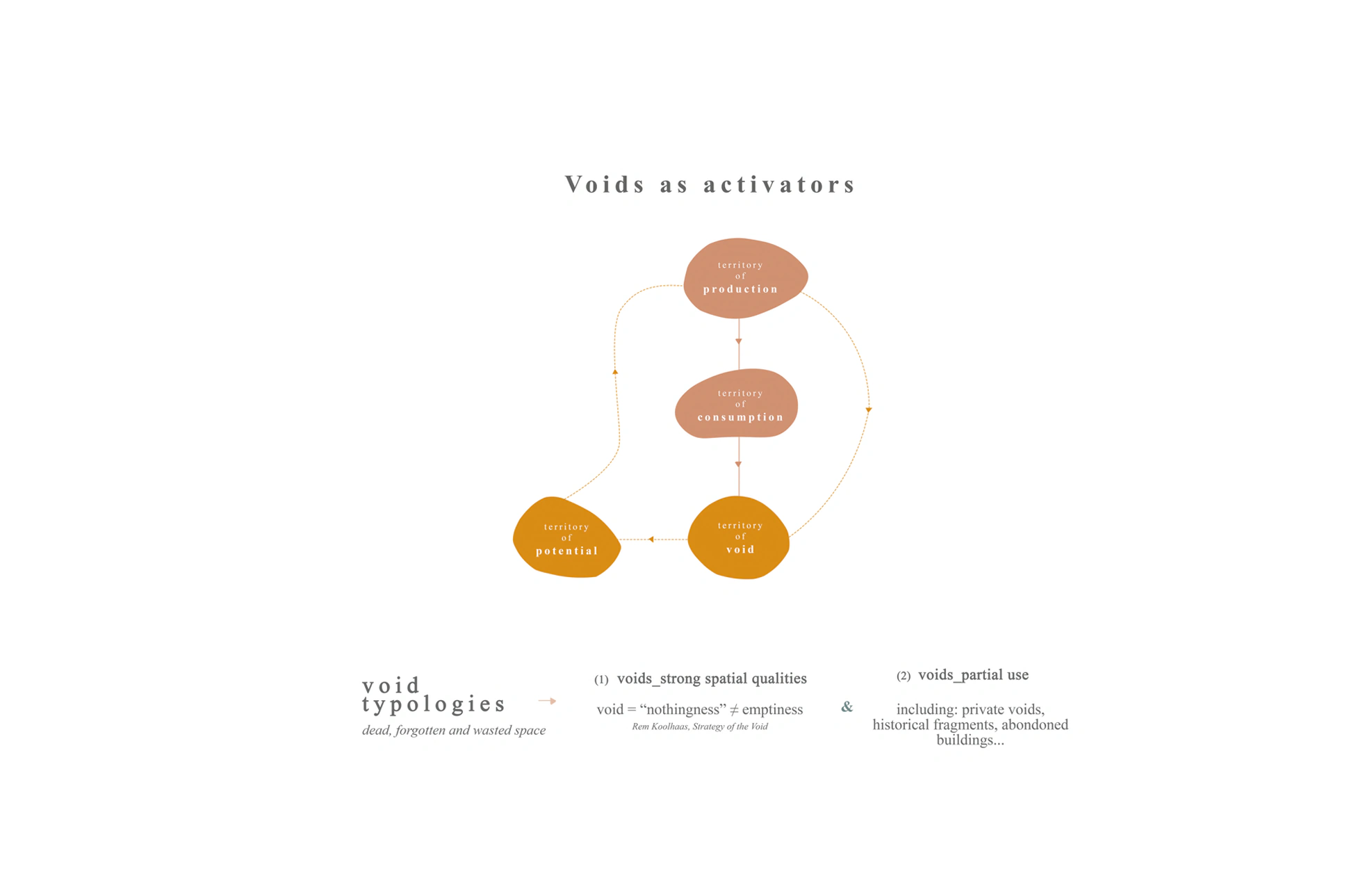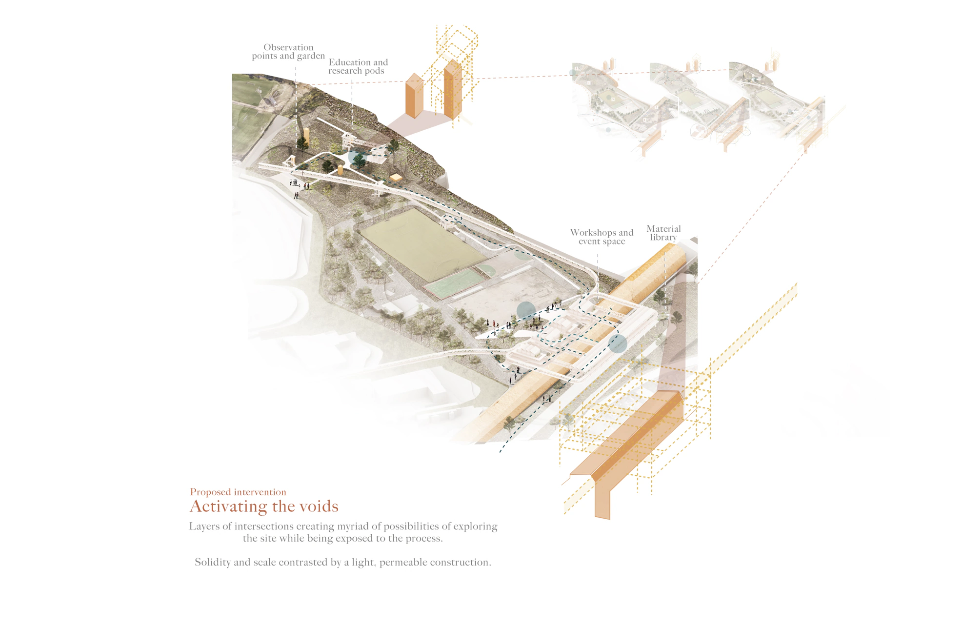 The intent is to activate the voids and trigger a self-sufficient system for rethinking waste. Voids are considered as territories of potential, where they work as a system of activators towards a more resilient community.