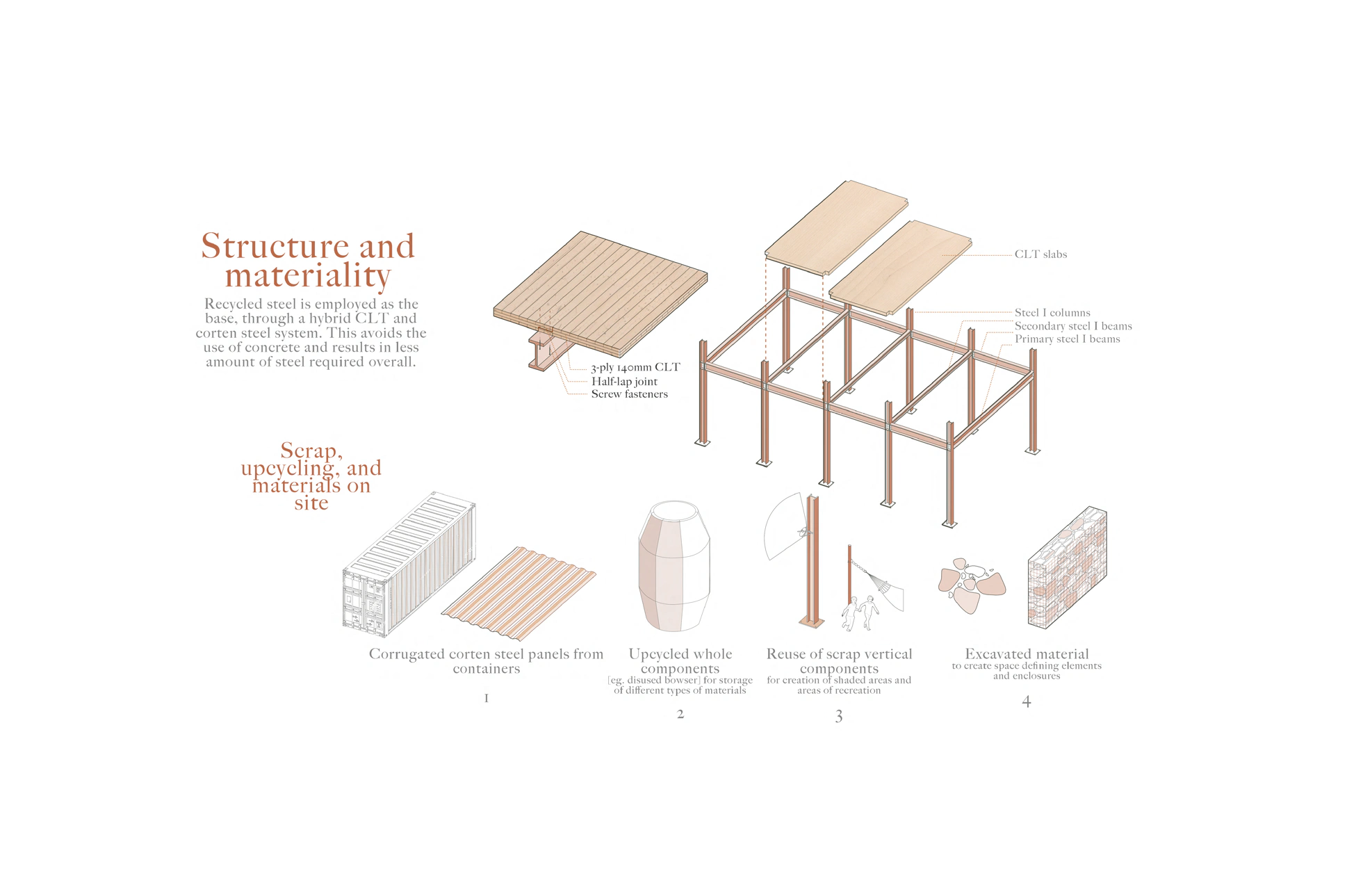 Apart from excavated material, scrap like corrugated metal panels from disused containers can be employed as a component of the roofing and cladding. Upcycled structural components can be employed in the creation of the event and recreational space, by slightly modifying them and allowing tensile structures to be erected as shelters.