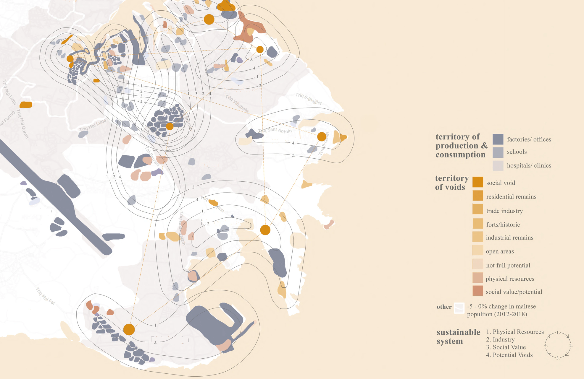 The current territories of production and consumption are mapped in the south of Malta. The territories of voids are mapped as well, including industrial remains, residential remains, those associated with trade, forgotten or abandoned fortifications and historic areas, places used byt not to their full potential; voids as presenting material resources; and social voids or places with significant social potential.