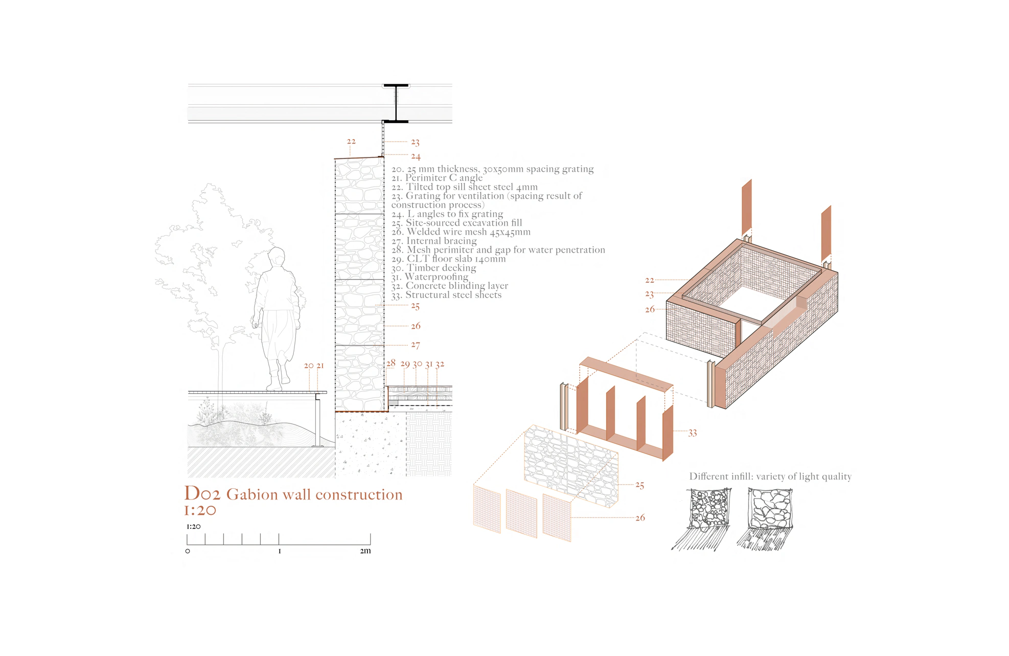 In order to emphasise the idea of reuse and upcycling, the excavated material and debris can be used for space defining elements and walls. This would directly expose debris as a building material, as well as visually lift the structure upwards. The gabion wall system works with a series of structural steel plates and supported by the columns. Due to the construction sequence, a space is needed on top of the wall from where debris is filled in. This becomes a perimeter of ventilation for these spaces. For the multipurpose rooms, different sized locally sourced debris can be utilised to create light filtering spaces. The structure therefore works as a transition: as the top tiers being steel, the ground floor tier being a gabion wall [thus steel and stone] and the fortification wall beneath [stone].