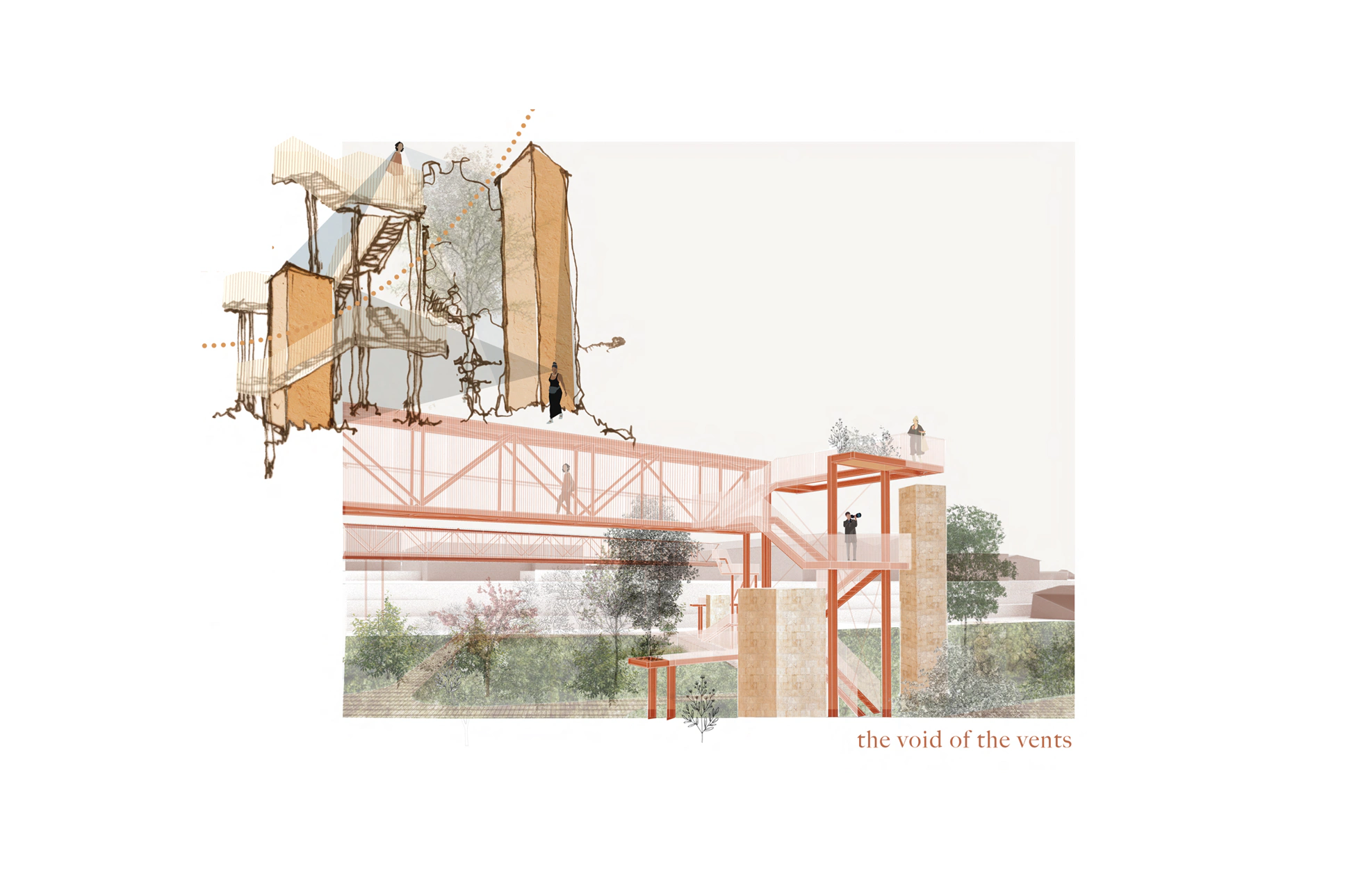 The space is reached through a continuing pathway from the workshop spaces. The built structures allow experience of the site at different heights, as well as add to the intrigue the void generates. This is highlighted since with the addition of greenery, the vents and interventions are partially hidden. The void is activated as here the students and researchers are able to meet and discuss in small groups, while experiencing their environment at full force. The act of climbing up becomes symbolic in terms of contrasting what the vents represent: a direct connection downwards.