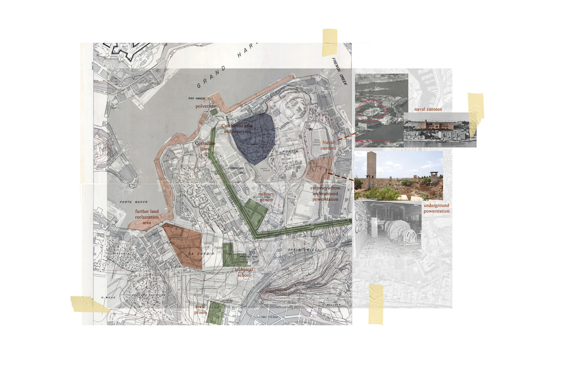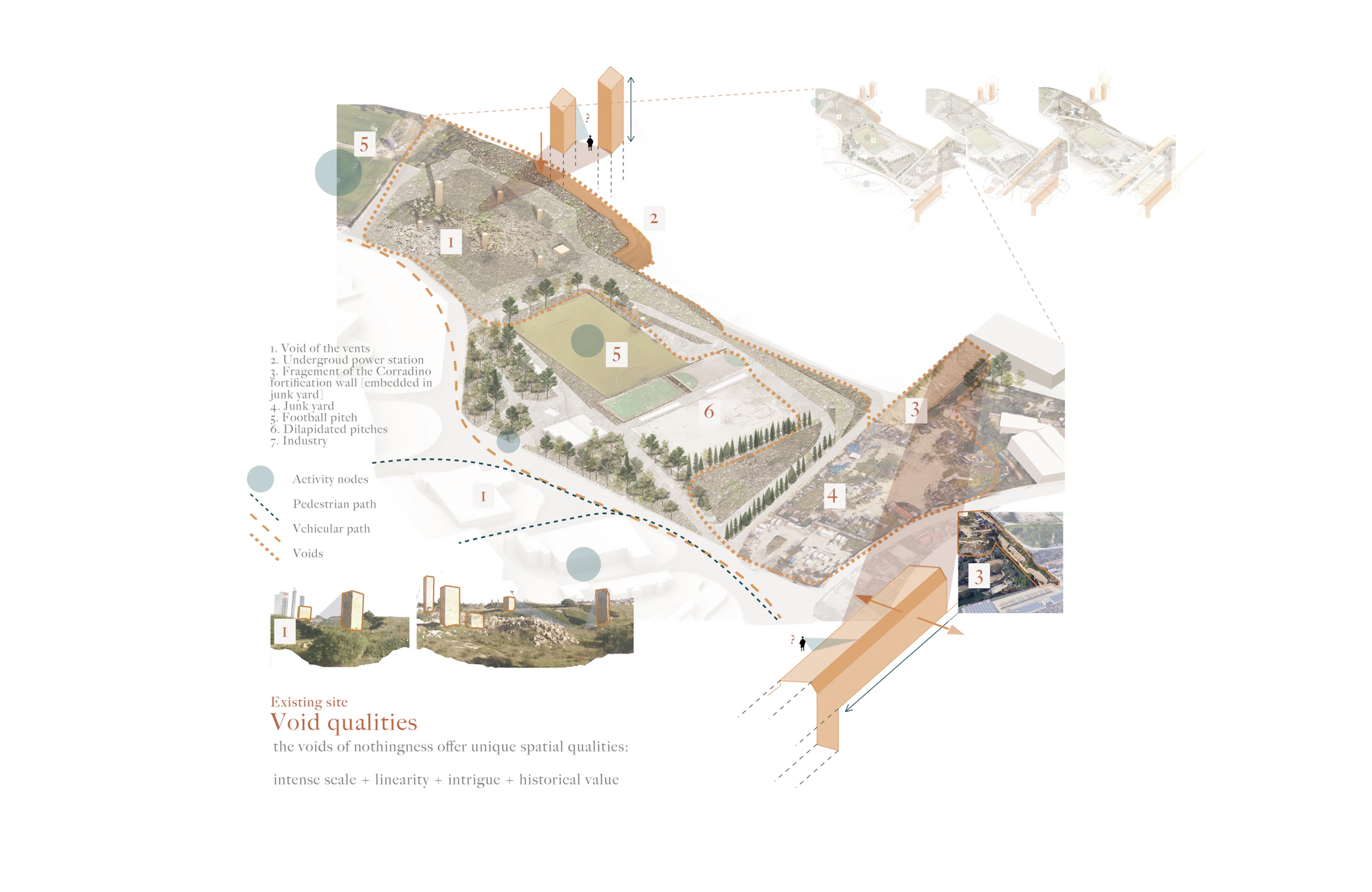 The area of focus involves dilapidated historic fragments: (a) a fragment of the 19th century Corradino Fortification Line and (b) the vents of the 20th century underground power station. The chosen sites have strong spatial qualities and are located at the periphery of Corradino Hill. At present, there is limited activity, making the whole area a void.