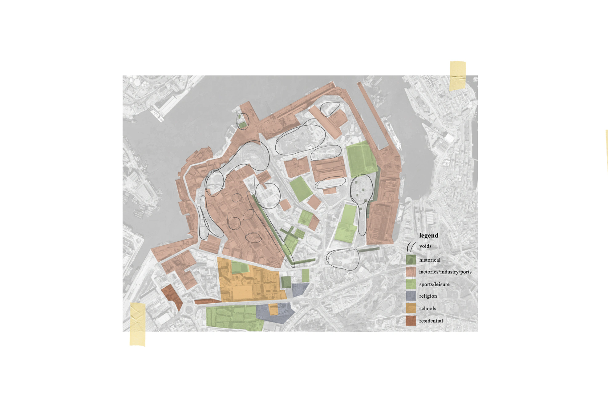 The project is an investigation of voids - i.e., forgotten, wasted or dead spaces - within the industrial estate of Kordin.