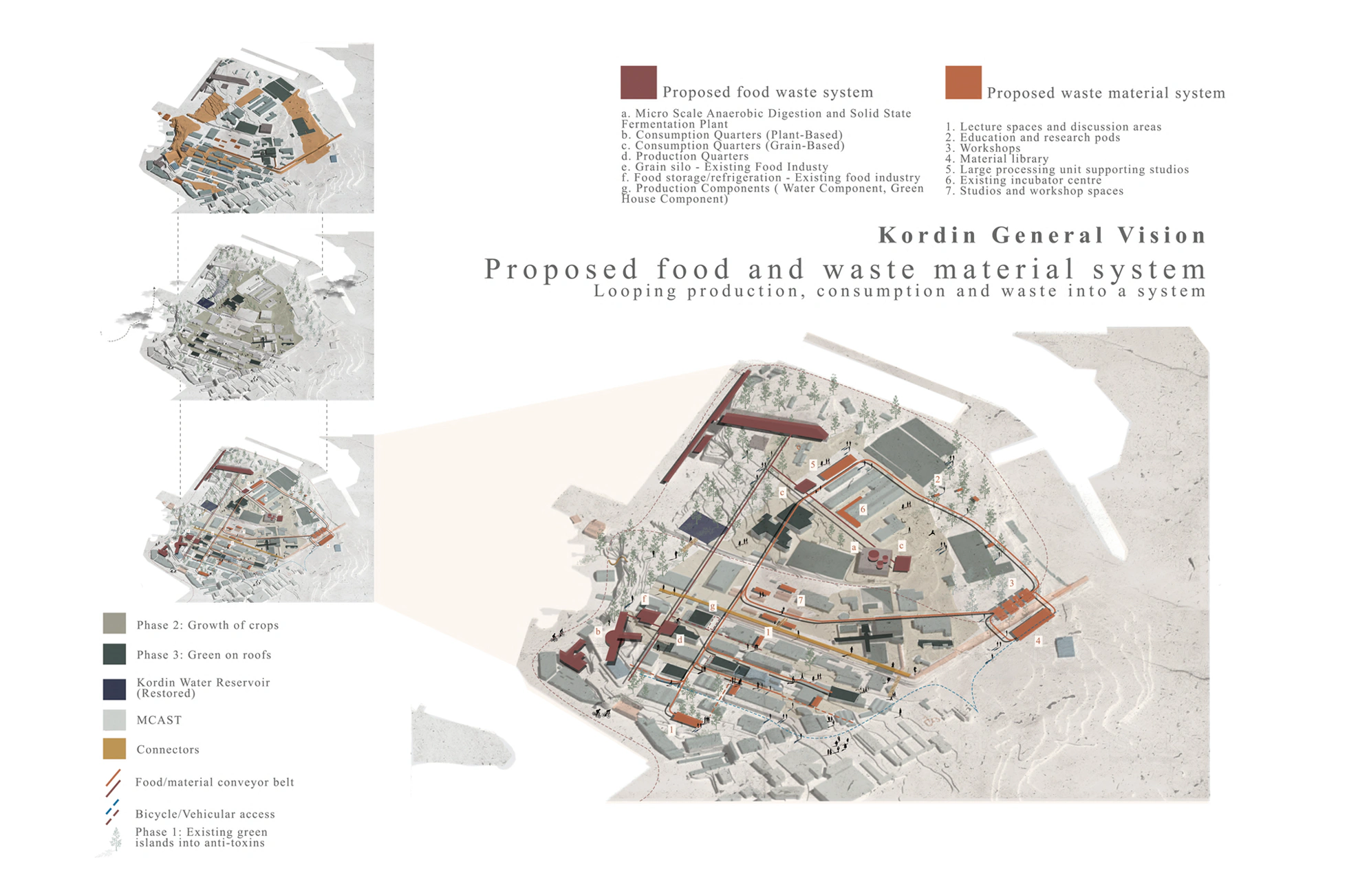 Briefly, the project evolved into focusing on two main industries identified within Kordin; that of food (by Maria) and the material industries (by myself). Hence the masterplan highlights the general approach of potential systems for both industries inspired by the notion of waste being potential, waste as a resource. Every intervention to sustain such a system is linked to a void, which are in turn seen as territories of waste or potential.