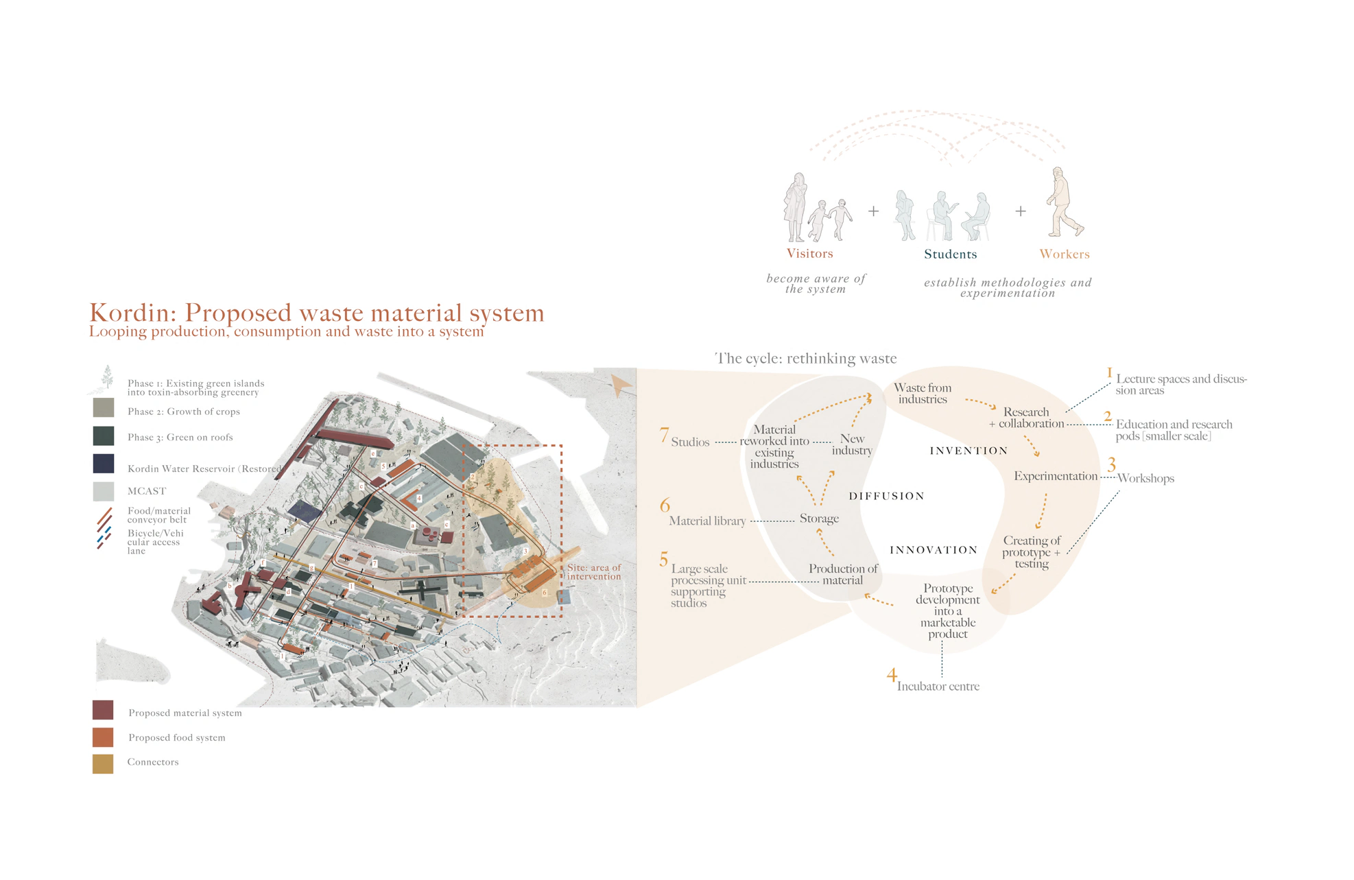 The activators are based on a hybrid of a science and research park involving waste material, originating from the users of the site and the opportunities in their collaboration – the workers (industrial core), the students (MCAST) and the visitors (sports and leisure facilities in Kordin). Thus, there is the opportunity to rethink waste materials that the industries are producing and reintroduce them within the cycle. Generally, science and research parks involve a dedicated sector of a unicersity, research centres for prototype creation and experimentation, and incubator centres. These are based on the pillars of invention, innovation and diffusion.