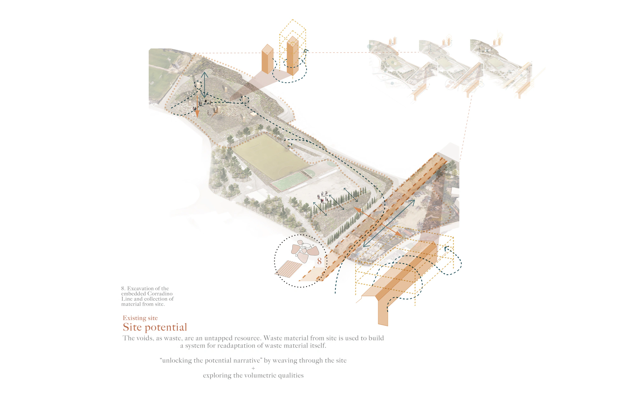 Voids, as waste, are an untapped resource. Waste material from the site can be used to build a system for readaptation of waste material itself. The junk yard offers scrap metal and possible structural members to be upcycled. Moreover, the Corradino Line can be excavated since we are considering depending less on vehicular transport.