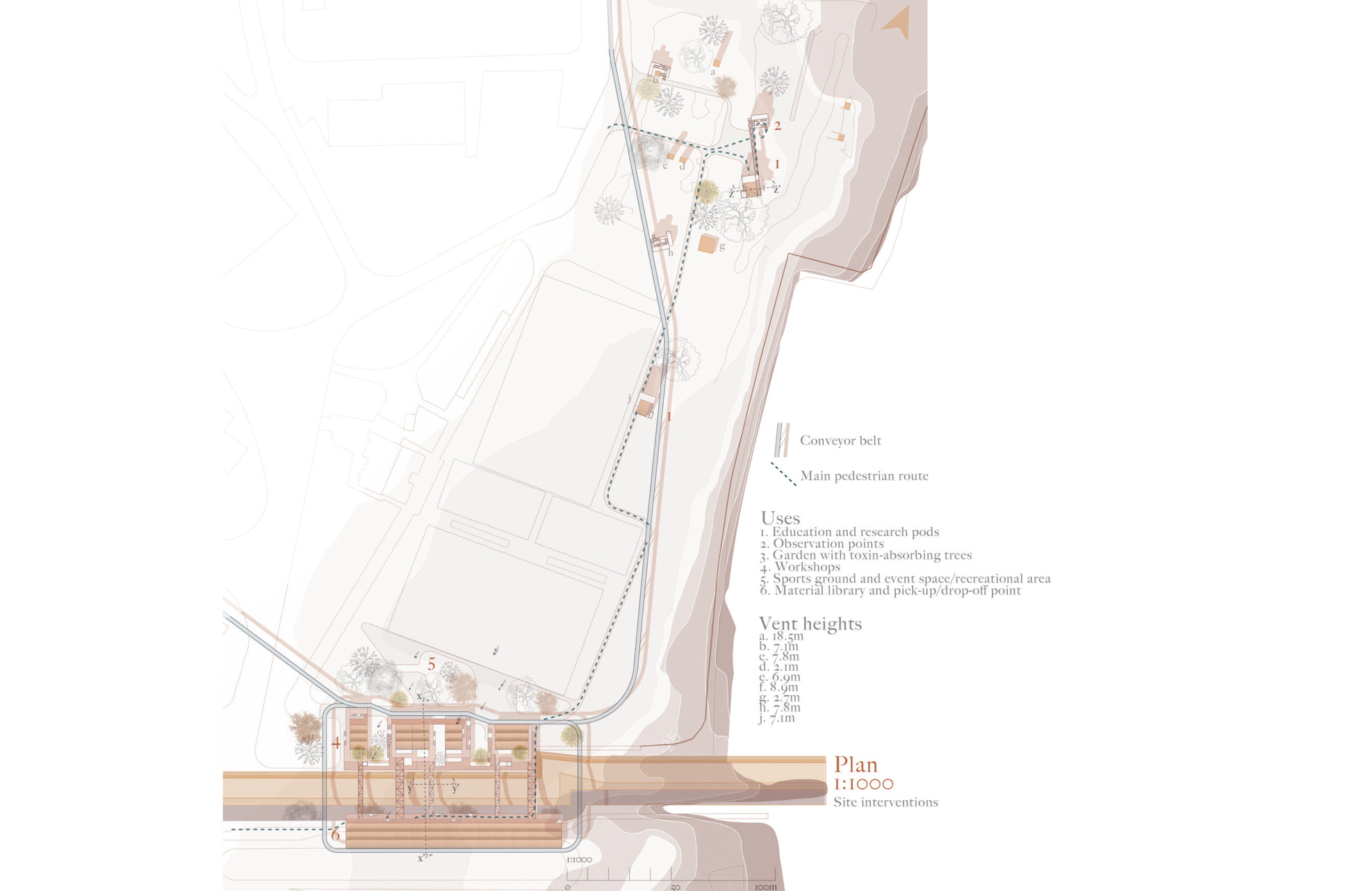 The space is reached through a continuing pathway from the workshop spaces. The built structures allow experience of the site at different heights, as well as add to the intrigue the void generates. This is highlighted since with the addition of greenery, the vents and interventions are partially hidden. The void is activated as here the students and researchers are able to meet and discuss in small groups, while experiencing their environment at full force. The act of climbing up becomes symbolic in terms of contrasting what the vents represent: a direct connection downwards.