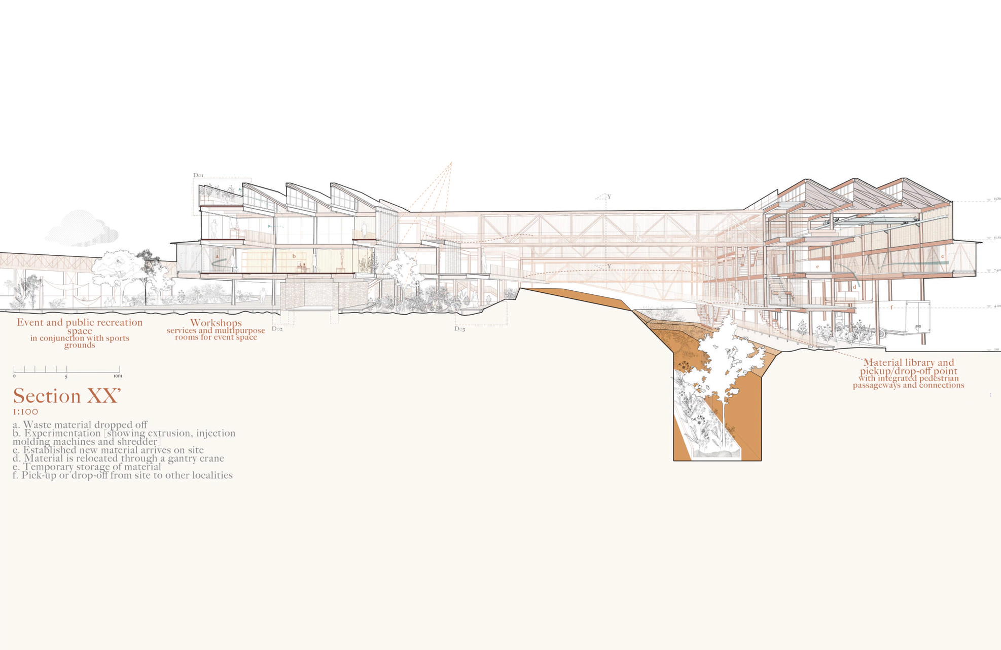 A material library, workshops and lecture spaces are thus proposed, allowing waste material to go through a process of research, experimentation, prototype creation, testing, development and redistribution. The material flow is through an interconnected conveyor belt system. The construction is based on the concept of rethinking waste material and thus, the activators themselves become a means for the public to be exposed to the process. The process is thus externalised, enabling anyone to participate in the next generation of materials. The activators are an exploration of the values of nothingness: an investigation of volumes, heights, linearity and immense scales, as a means of valuing the spatial quality of the voids present.