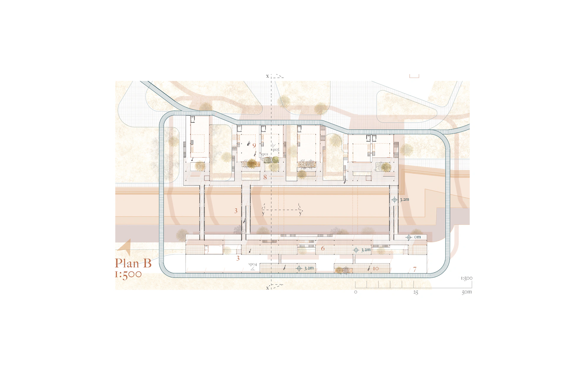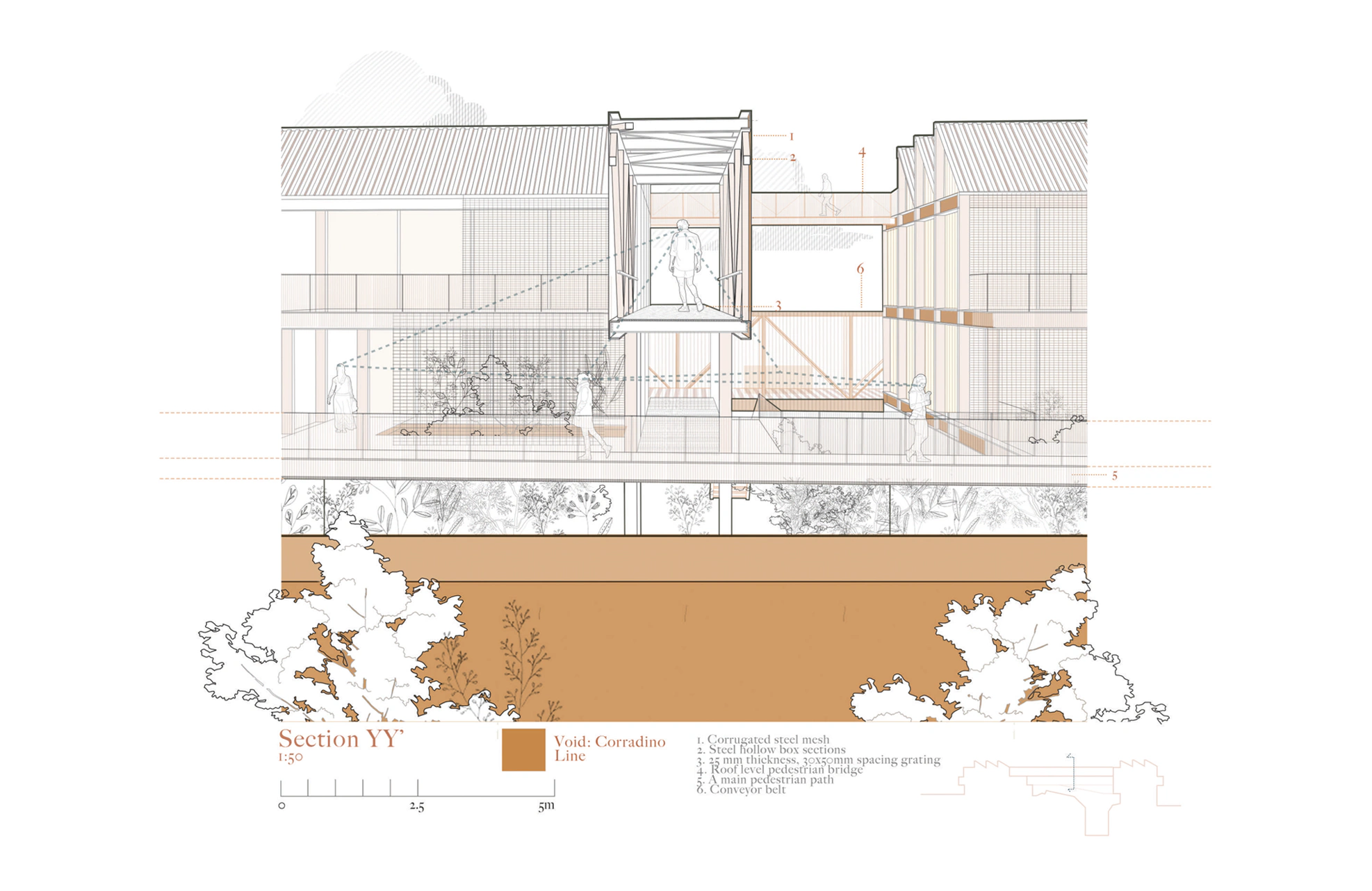 The space behind the workshops is next to a sports ground, and this is an opportunity to cater for an event and recreation space. This space caters for talks and open air lectures, outdoor exhibitions, student sports matches and lingering space. Landscaping is designed to connect the ground floor level to the football grounds. There is a direct connection between the back of the workshops to the conveyor belt, allowing material to be directly transported into the workshops.