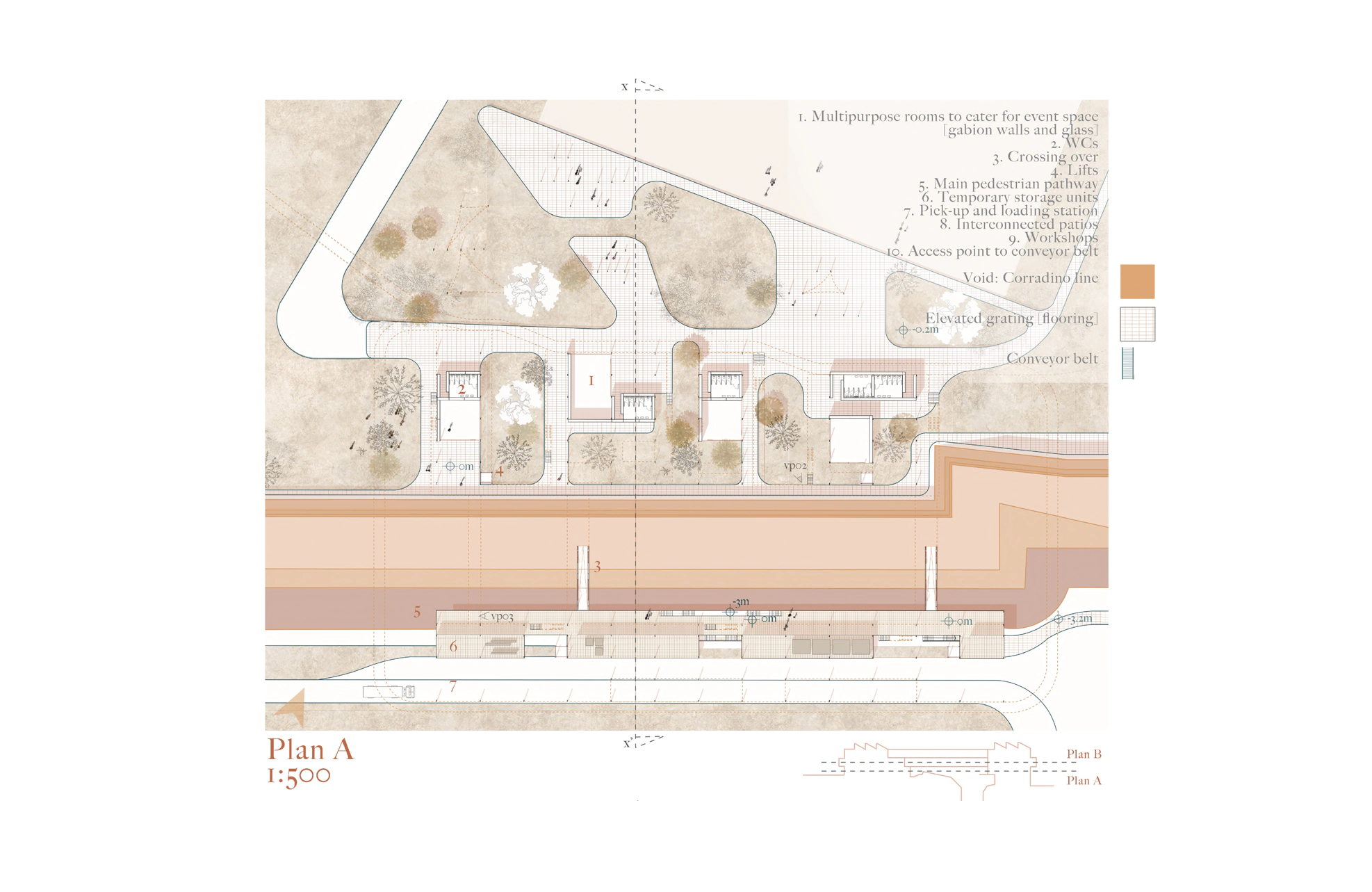 The material library and workshops + event space are proposed at the void of the Corradino Line. The material library runs parallel to the Corradino Line, emphasising its linearity. It incorporates a pedestrian pathway and a stepped interface that is connected to the main pathway, enabling people to cross over at different levels. The material library involves also temporary storage units for materials. Pedestrians can see what is inside as they are travelling through the pathway and interface to cross over.