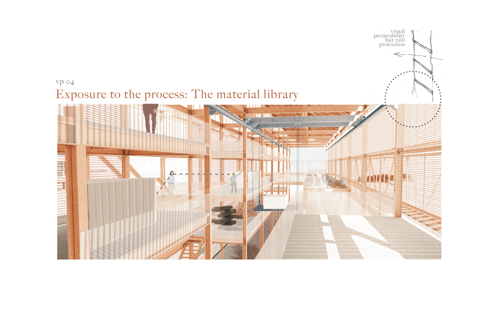 There is also the pickup and dropoff point of material from the conveyor belt, which is directly connected. Material arriving from the conveyor belt is moved either towards the storage units or towards ground floor level, where moving trucks can transport it away. This movement is enabled via a gantry crane system incorporated in the material library. The storage units are aligned and placed linearly, so that the gantry crane is able to reach laterally and longitudinally. Through form finding and exploration, the material library evolved into one structure connected over the ditch and Line.
