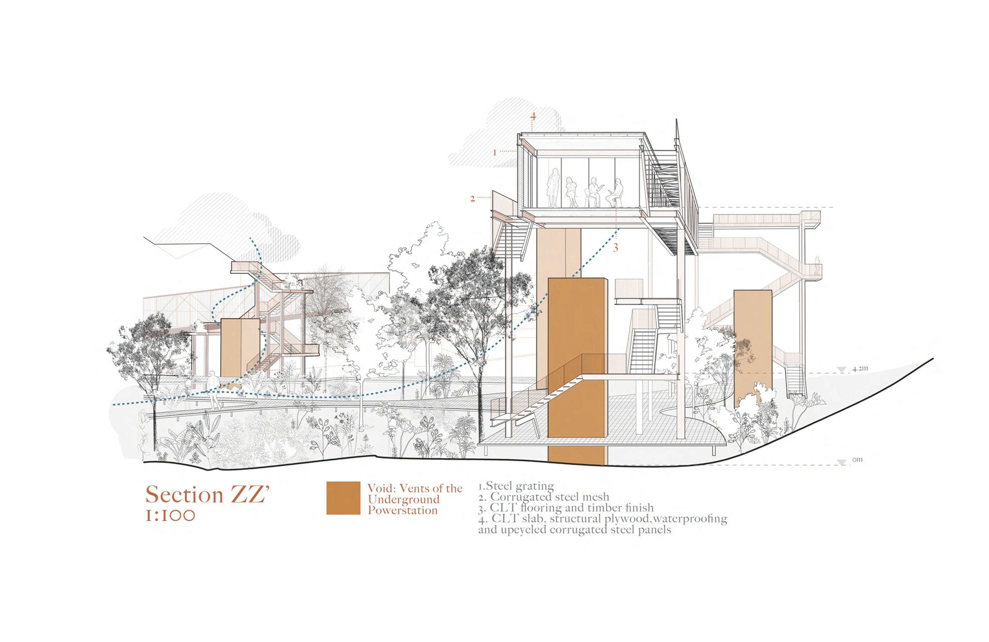 The pathway is a reinterpretation of the axes of the underground power station, which becomes a reference to the industrial heritage below. There is access to these structures, as the pathway is level and lifts are provided. However, people are free to roam about the site, thus part of the pathway is isolated from the rest.